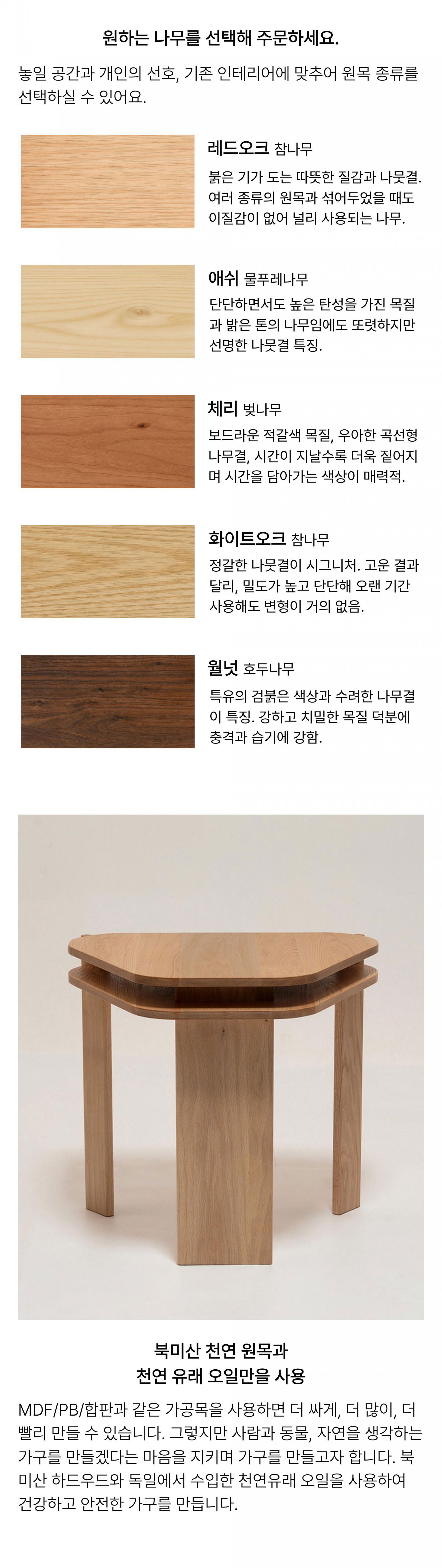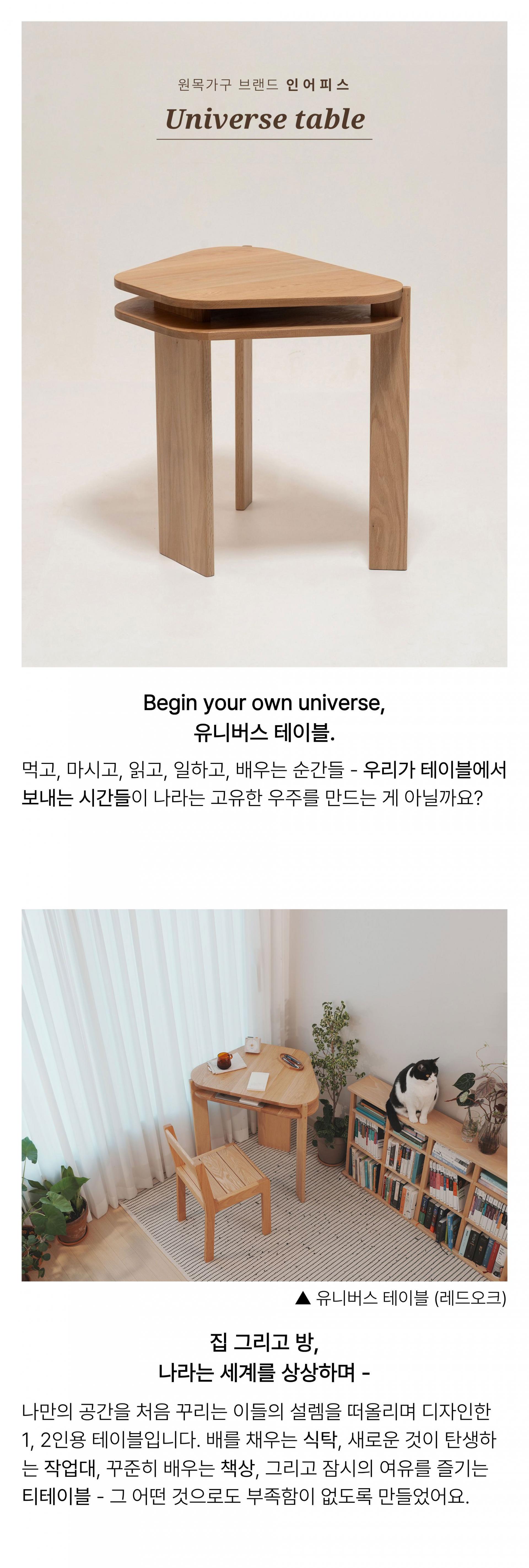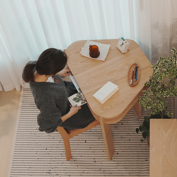 나만의 공간을 처음 꾸리는 이들의 설렘을 떠올리며 디자인한 1, 2인용 테이블입니다. 배를 채우는 식탁, 새로운 것이 탄생하는 작업대, 꾸준히 배우는 책상, 잠시의 여유를 즐기는 티테이블- 그 어떤 것으로도 부족함이 없도록 만들었어요.