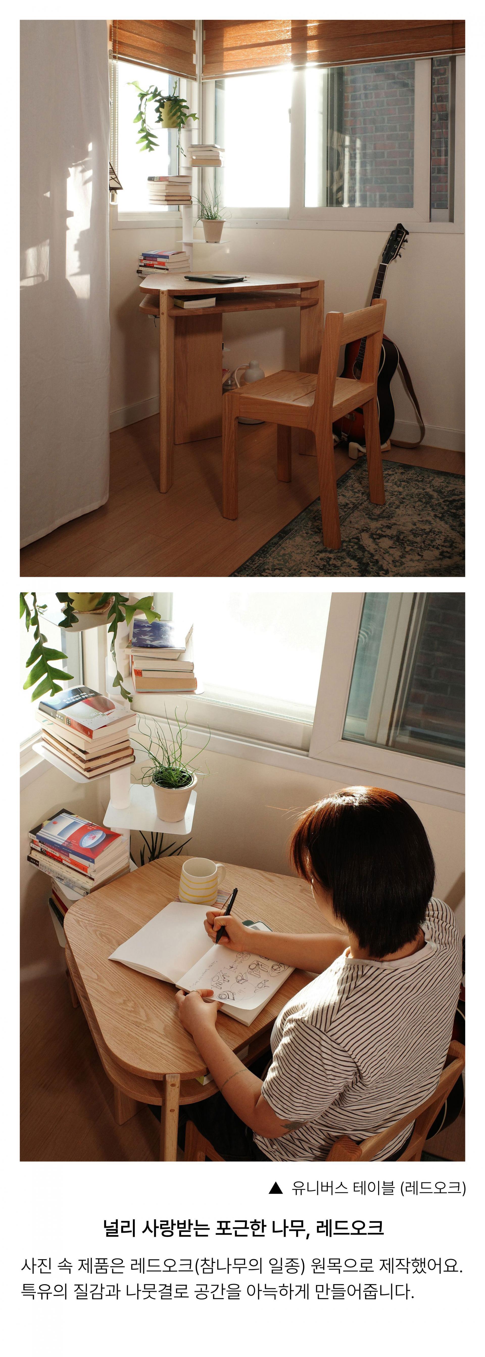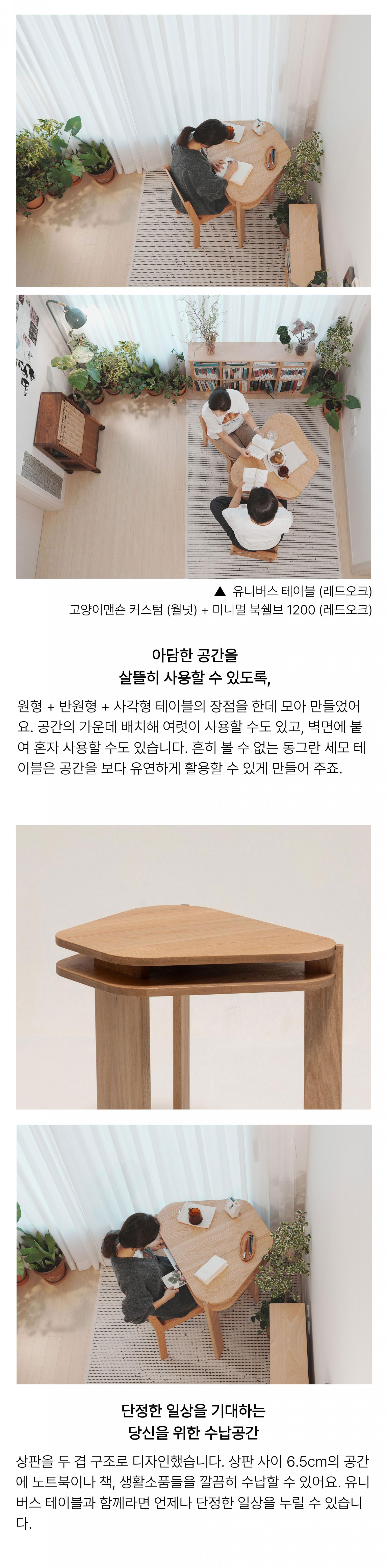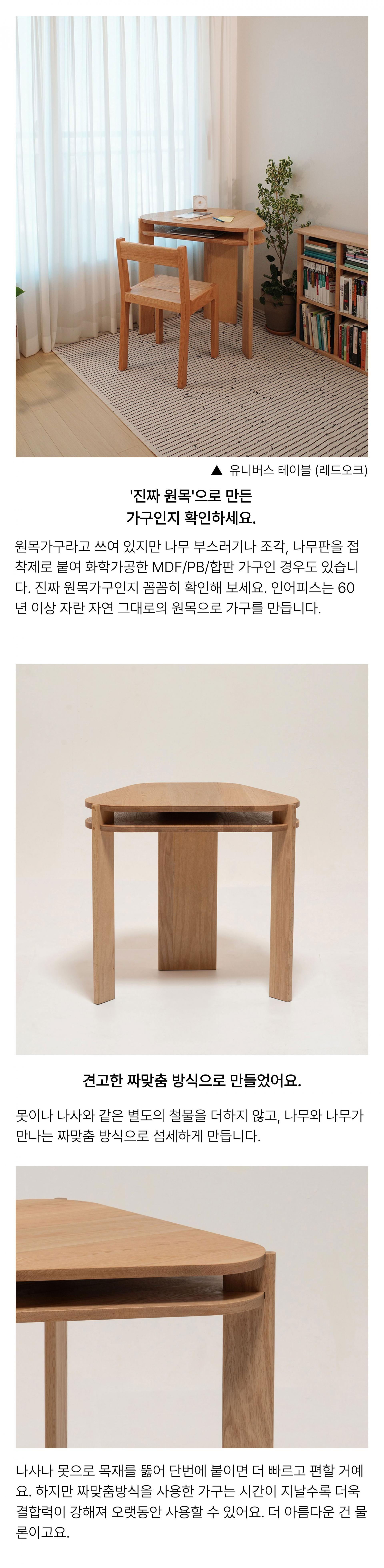 나만의 공간을 처음 꾸리는 이들의 설렘을 떠올리며 디자인한 1, 2인용 테이블입니다. 배를 채우는 식탁, 새로운 것이 탄생하는 작업대, 꾸준히 배우는 책상, 잠시의 여유를 즐기는 티테이블- 그 어떤 것으로도 부족함이 없도록 만들었어요.