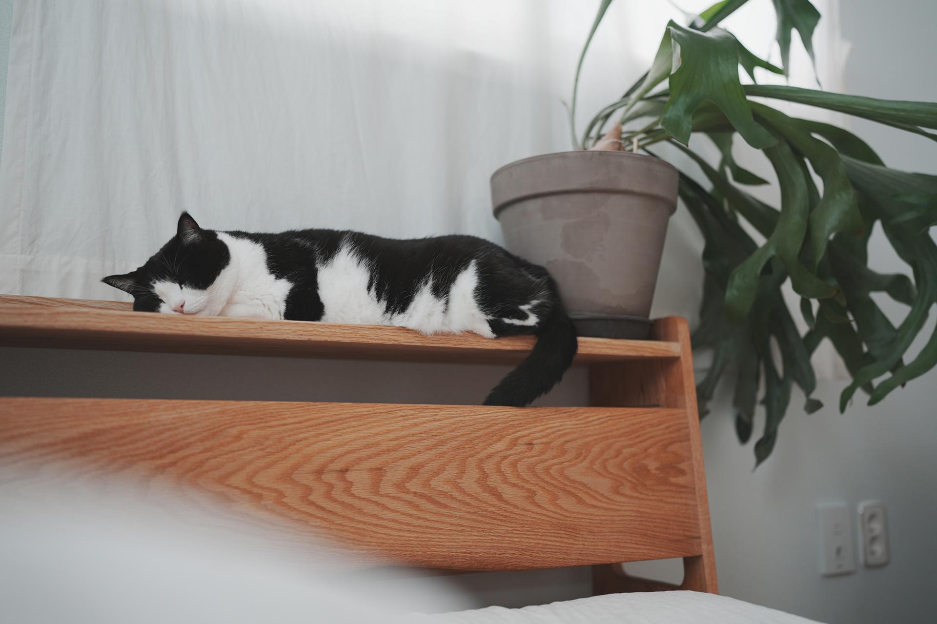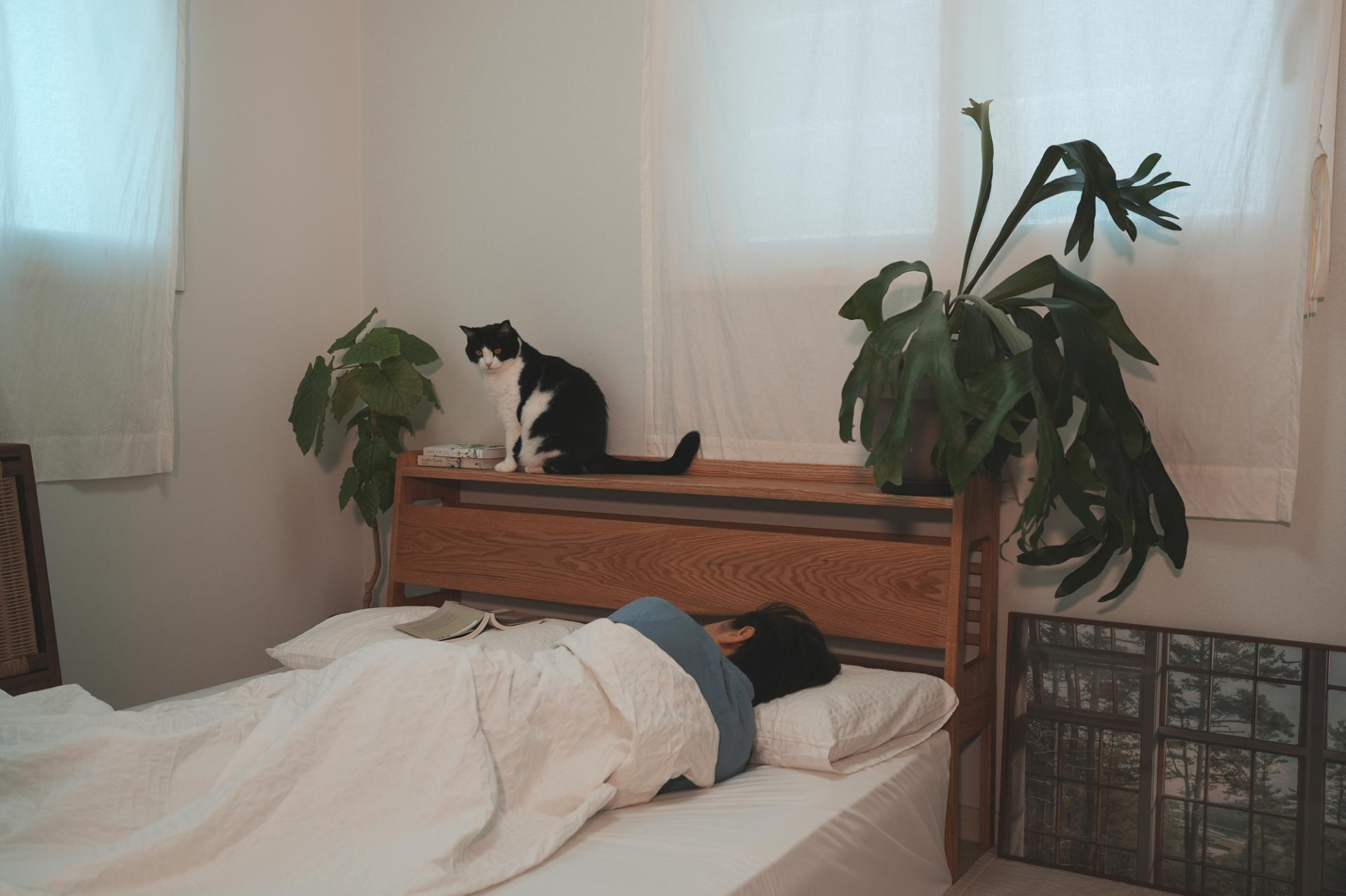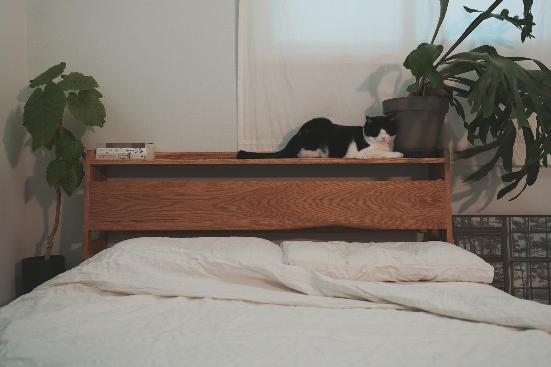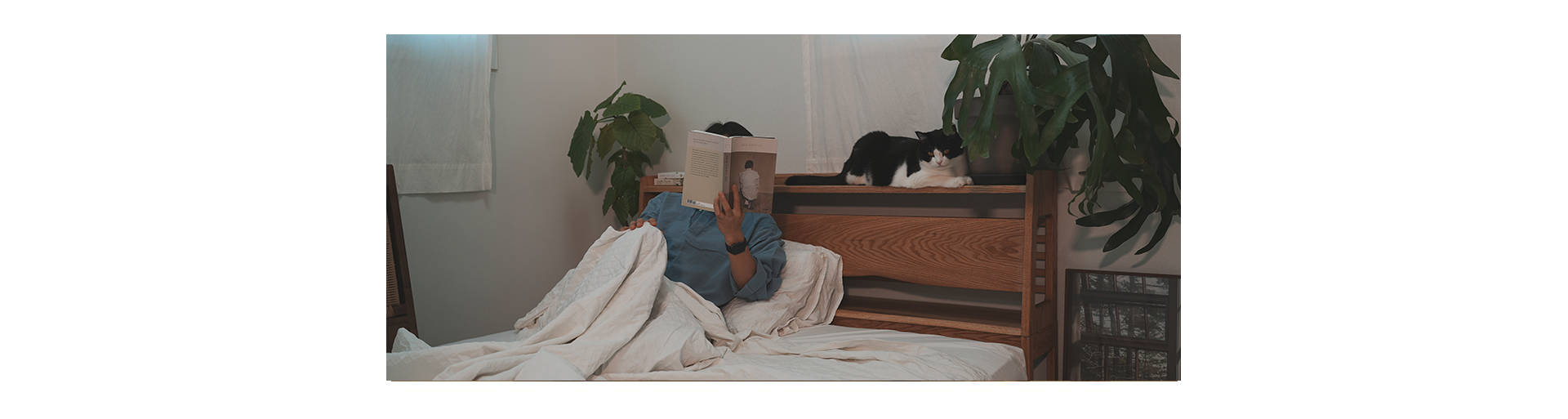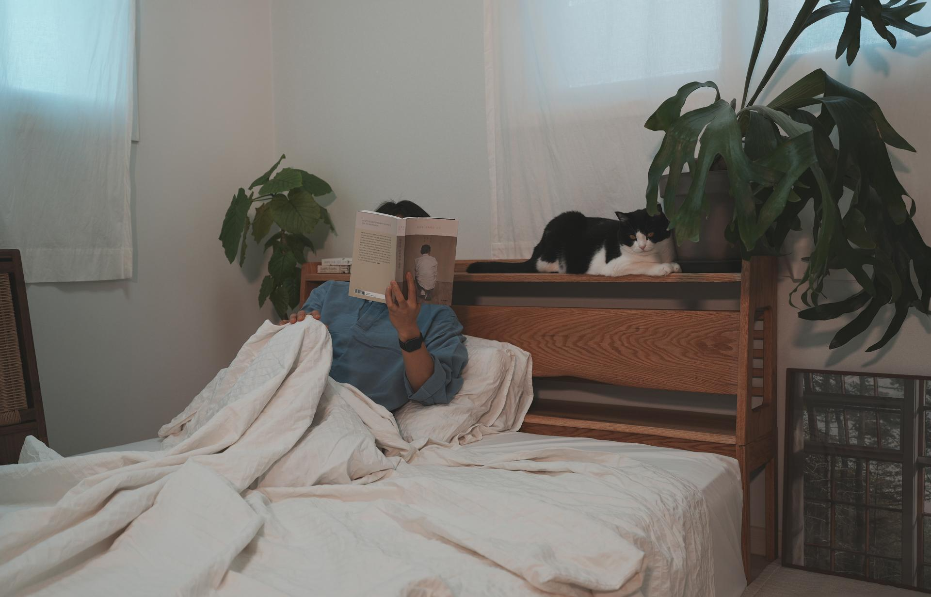 그 사실을 깨닫게 된 이후로 반려묘와 침대에서 보내는 시간이 길어졌습니다. 함께 누워 휴식하기도 하고, 이불과 베개를 은신처 삼아 술래잡기를 하기도 합니다. 제가 침대에 기대어 책을 읽고 있으면- 침대 아래 숨어 있던 고양이가 냥냥펀치를 챡, 날리기도 한답니다. 그렇게 한참을 함께 놀던 고양이는 베개 옆에 누워 스르르 잠들어요. 그 모습을 지켜보다 보면 어느새 저도 잠이 오고요.