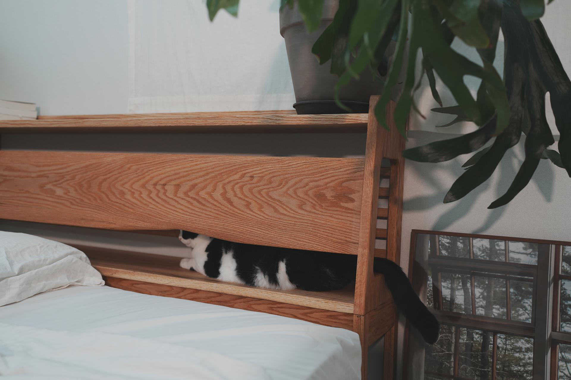 휴펫침대(Share the bed)는 사람과 반려동물이 따로 또 같이 사용할 수 있는 침대입니다. 헤드 앞판과 뒤판 사이에 고양이가 사용할 수 있는 독립공간이 마련됩니다. 고양이의 경우, 숨숨집이나 캣터널과 같은 휴식/놀이공간으로 활용하곤 합니다. 또 헤드 윗부분은 고양이가 자유롭게 오르내릴 수 있는 수직공간이자 다양한 생활용품을 올려놓을 수 있는 수납공간이기도 합니다.