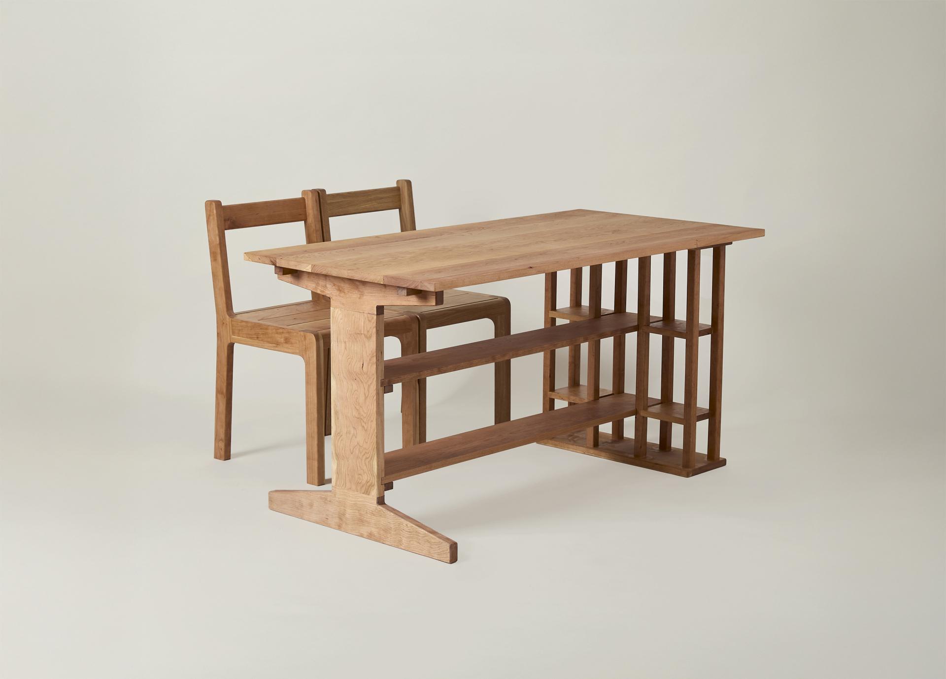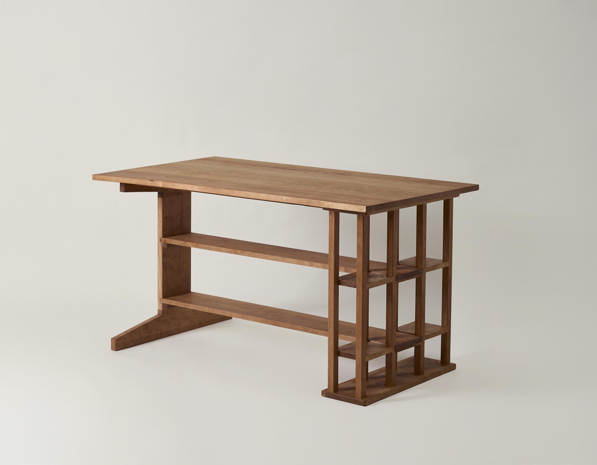 3 ~ 4인이 함께 사용할 수 있는 다이닝테이블 겸 데스크입니다. 간결하고 안정적인 모양이지만 한 쪽 다리에 책장 겸 수납공간으로 활용할 수 있는 선반을 빌트인했어요. 테이블을 가로지르는 두 단의 원목 프레임은 테이블 위를 항상 깔끔하게 유지하고 싶은 분들을 위한 추가적인 공간입니다. 반려묘가 있는 경우 캣워크로도 활용할수 있고요.