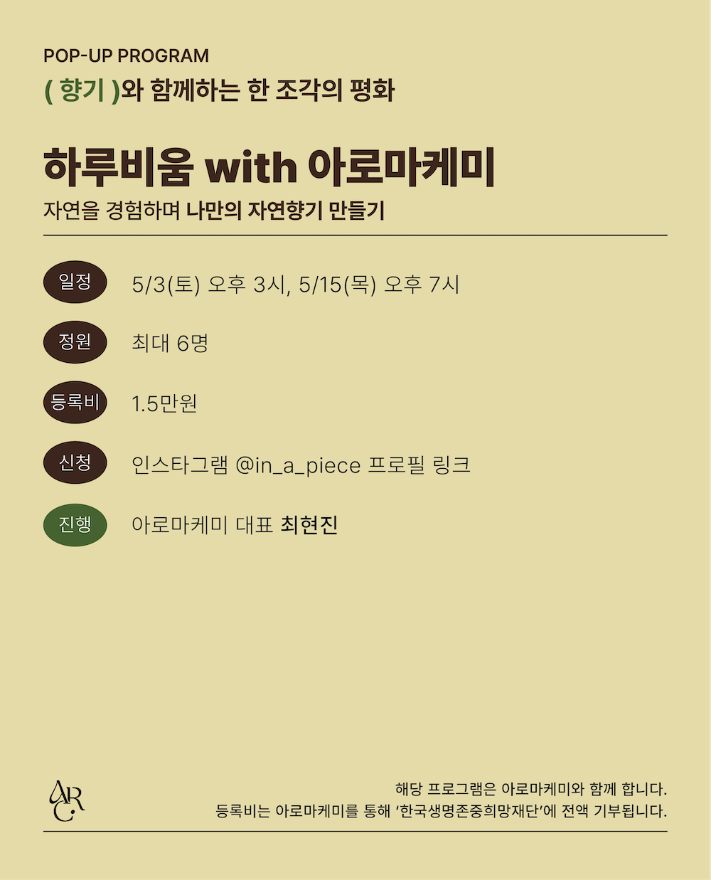 - 향기와 함께하는 한 조각의 평화 프로그램의 등록비는 아로마케미를 통해 한국생명존중희망재단에 전액 기부됩니다.