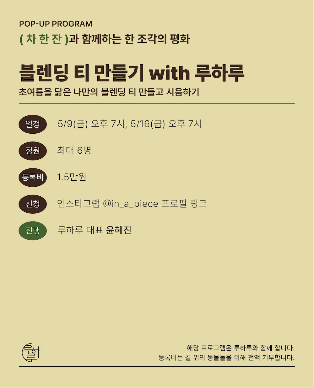 프로그램에 참여하시는 분들께는 루하루에서 준비한 블렌딩티(아이스 한정)를 제공합니다. 일회용품을 사용을 줄이기 위해 텀블러를 지참해주시면 좋을 것 같습니다. 미처 준비하지 못하신 분들을 위해 생분해 옥수수로 만든 친환경 플라스틱컵도 준비하겠습니다.