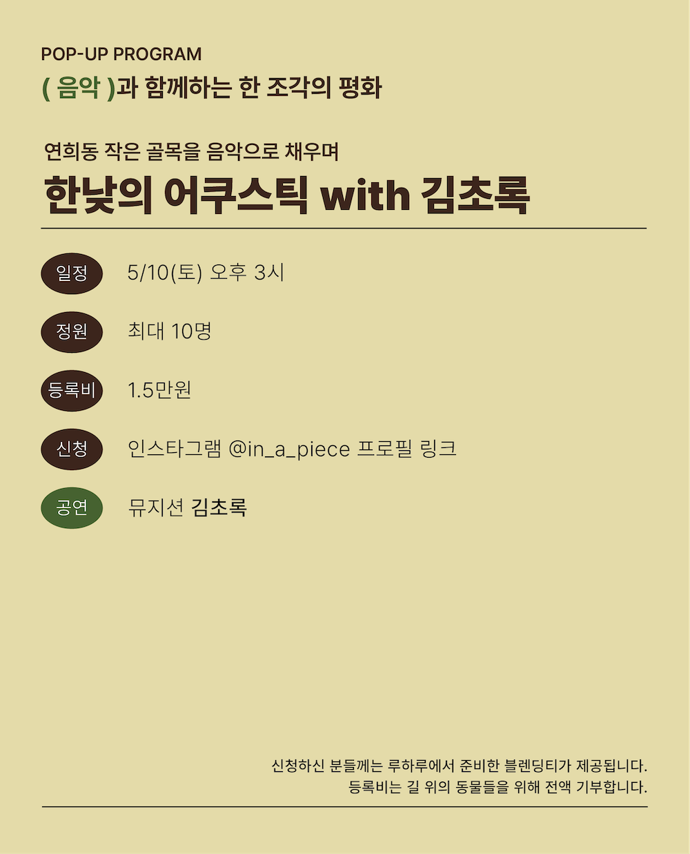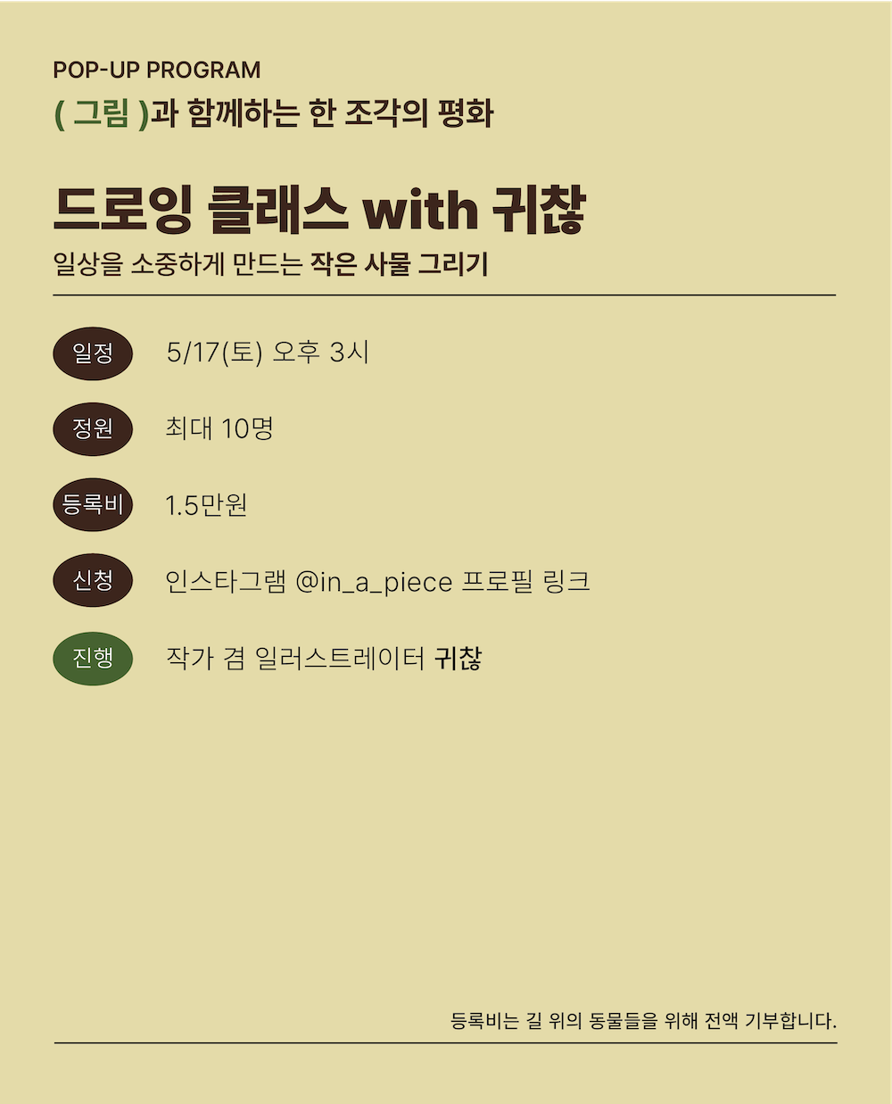 팝업스토어 '한 조각의 평화' 현장 프로그램 예약페이지입니다. 등록비 15,000원은 길 위에 동물들을 위해 전액 기부합니다(웰컴쿠폰 사용이 불가한 상품입니다).