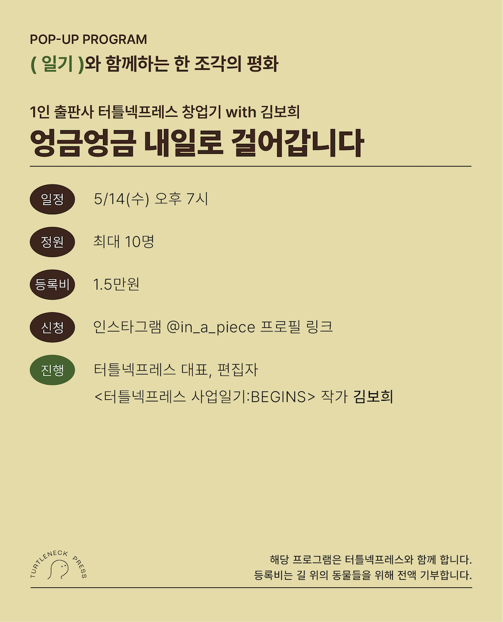 책을 좋아해서 책 때문에 거북목이 된 사람들을 위한 출판브랜드, 터틀넥프레스를 아시나요? 이 브랜드를 만들고 있는 김보희 대표님과 함께해요. 최근 브랜드를 시작하며 기록했던 일기를 모아 만든 책,《터틀넥프레스 사업일기:BEGINS》를 출간하셨는데요. 책의 북토크이자 작은 브랜드들을 만들어간 내밀한 이야기를 함께 나누는 프로그램입니다. 자기만의 브랜드를 만들고 싶거나 만들고 계신 분들께 제안드려요.
