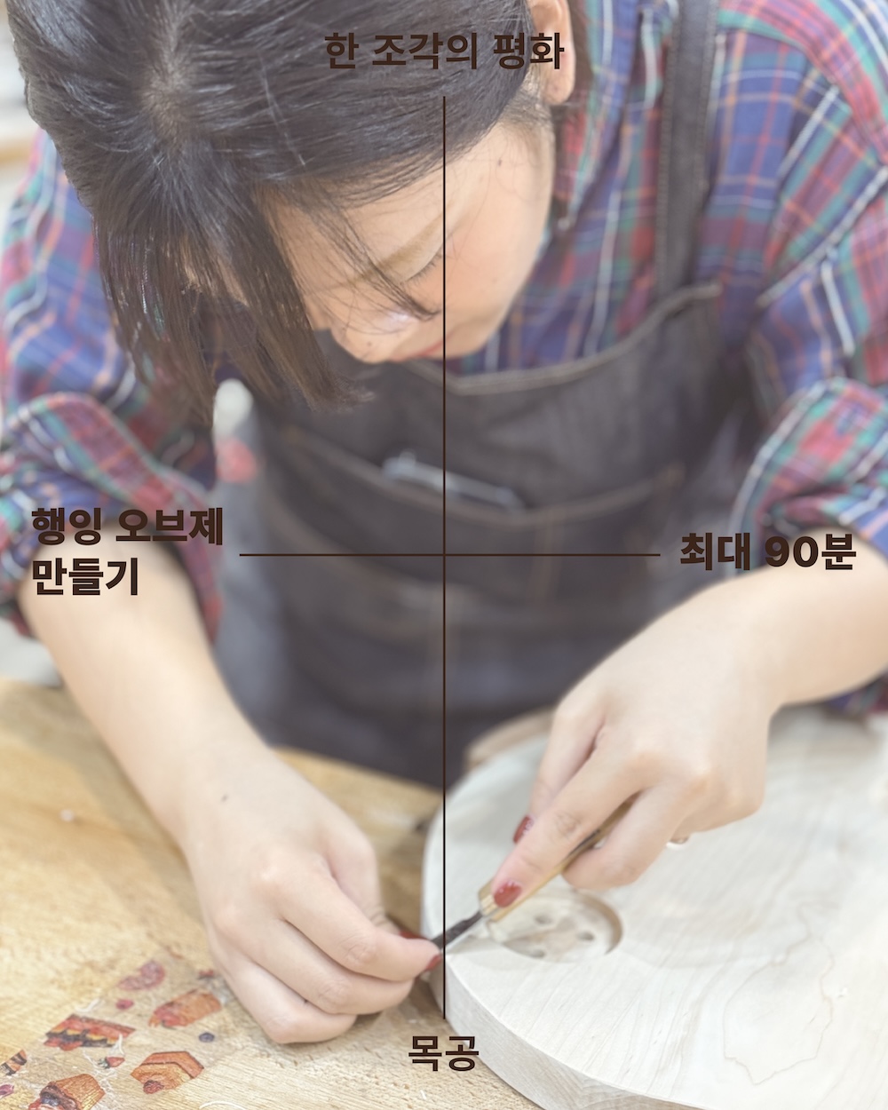 다양한 원목을 골라 행잉 오브제를 완성하고 가져가실 수 있는 프로그램입니다(최대 90분 소요). 나무를 만지며 한 조각의 평화를 느낄 수 있는 작은 목공 클래스예요.