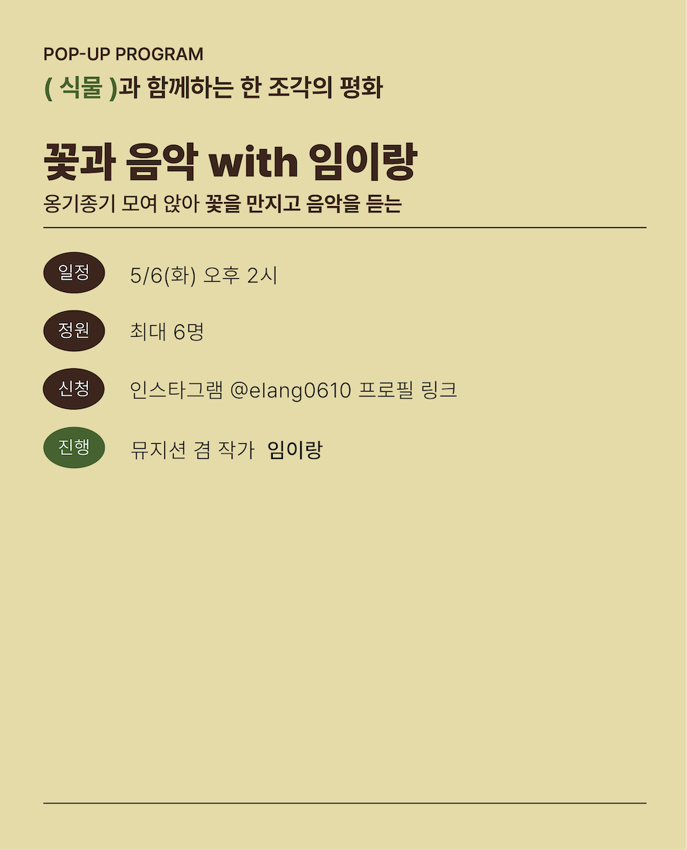 뮤지션 겸 작가인 이랑님과 함께 꽃을 만지며 음악을 듣는 프로그램입니다(120분 소요). 봄 - 여름꽃을 병꽂이하고요, 돌아가실 땐 풍성한 병꽂이를 들고 가게 됩니다. 해당 프로그램은 이 페이지가 아니라 이랑님의 개인 인스타그램을 통해 등록하실 수 있어요.