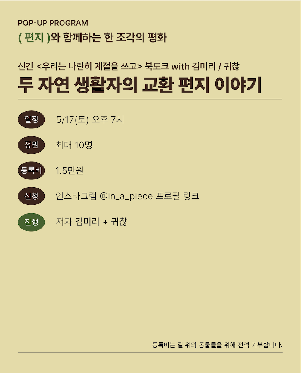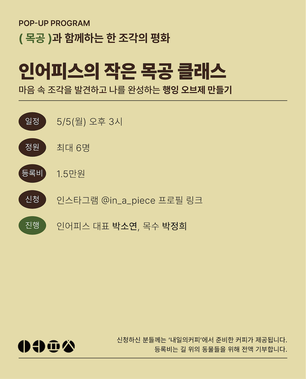 - 목공, 차, 음악, 일기, 그림, 편지와 함께하는 한 조각의 평화 프로그램의 등록비는 길 위의 동물들을 위해 전액 기부합니다.