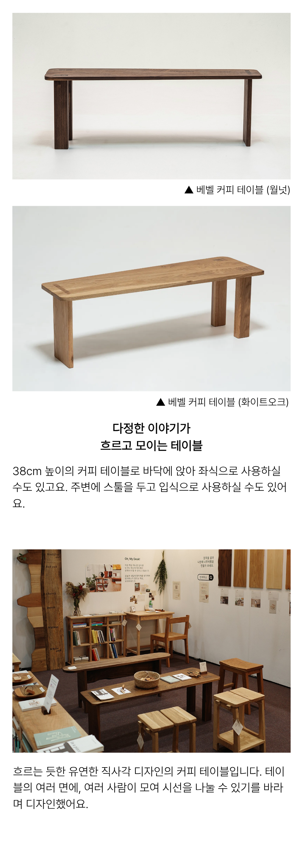 38cm 높이의 커피테이블로 바닥에 앉아 좌식으로 사용하실 수도 있고, 주변에 스툴을 두고 입식으로 사용하실 수도 있어요.